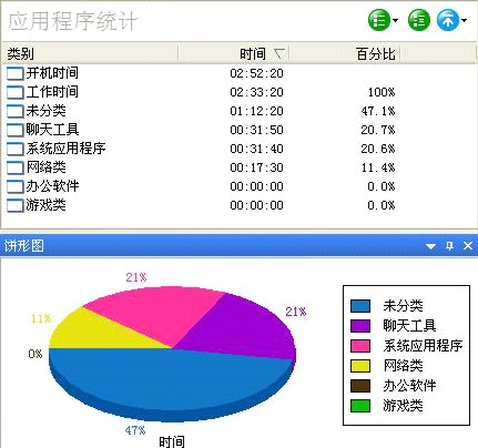 | 应用程序 | 1、 可以在指定的时间禁止指定的应用程序运行。 2、 通过日志浏览每台电脑运行了哪些应用程序。 |