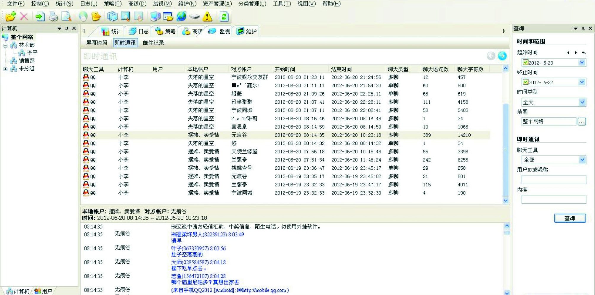 | 即时通讯 | 1、 可以对即时通讯工具传送的文件进行控制和记录。 2、 监控QQ、MSN等聊天记录。 |